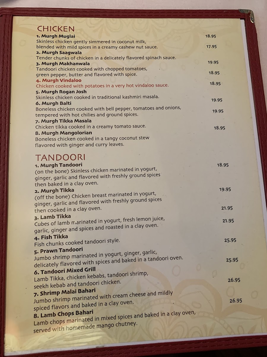 Priced per person. Served with samosa (1), aloo gobi, chana masala, and tandoori roti.